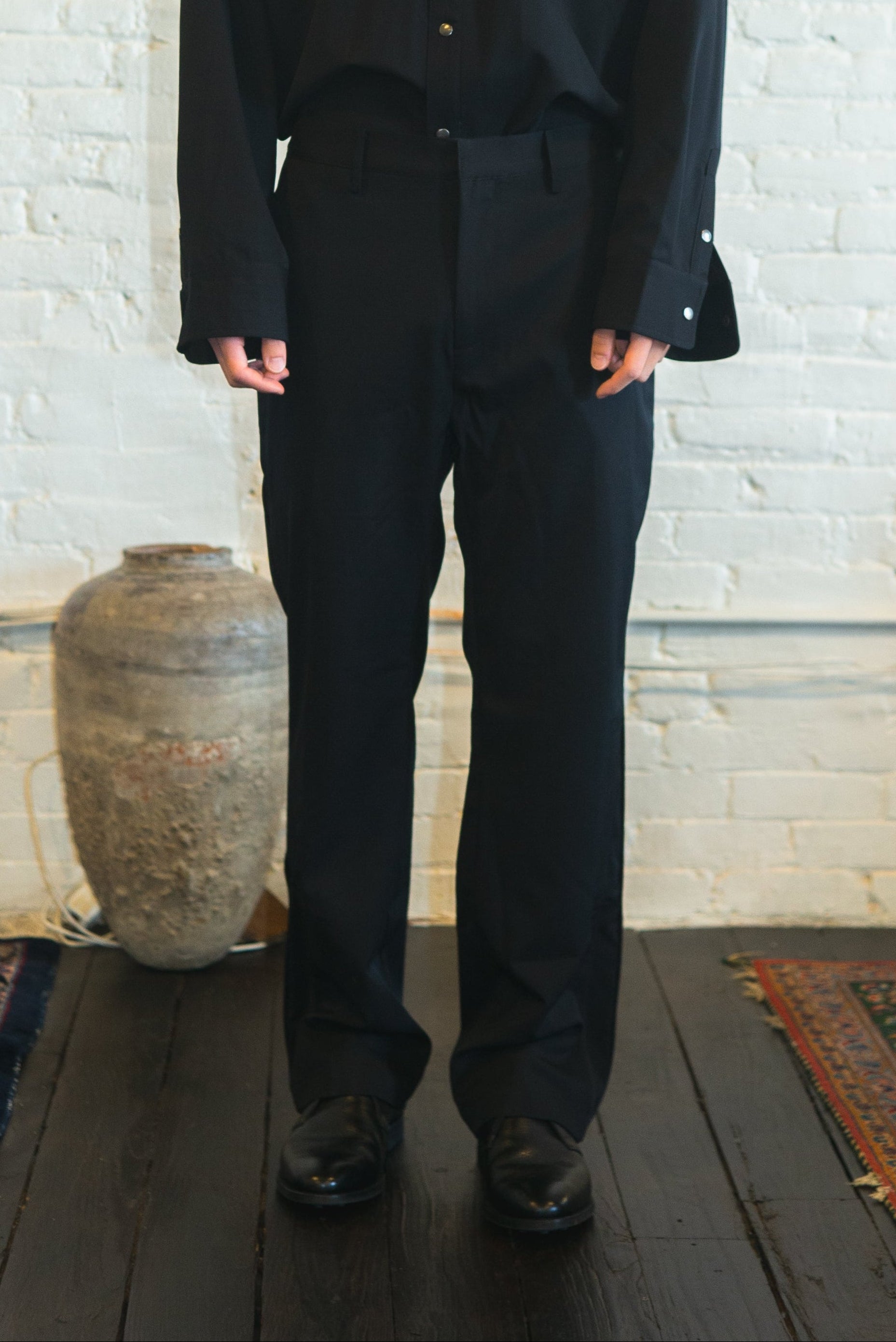 The ROGER trouser, made of 100% 280 gram wool fabric, has many identities. In its purest form, it is a straight fitting trouser with an elastic waistband at the back. The trouser has a full zipper running alongside the outside seam, and when unzipped, additional fabric allowance allows for the experimentation of silhouette and fit. The trouser can range from slimmer fit, to a flare fit, to a fully wider fit trouser from waist to hem. Signature hand embroidery on waistband.